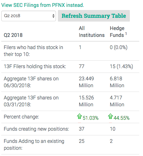 In the 2nd quarter of 2018, institutions increased their holdings in PFNX by over 50%.