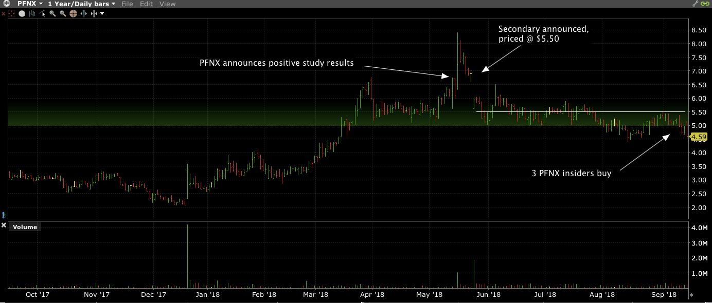 PFNX’s 2nd quarter 13F increases were mostly the result of a secondary offering of about 7.8 million shares (including underwriters’ over-allotment) that was well received. The offering was priced at $5.50 on May 23. As of Sept. 14, PFNX was trading at $4.59.
