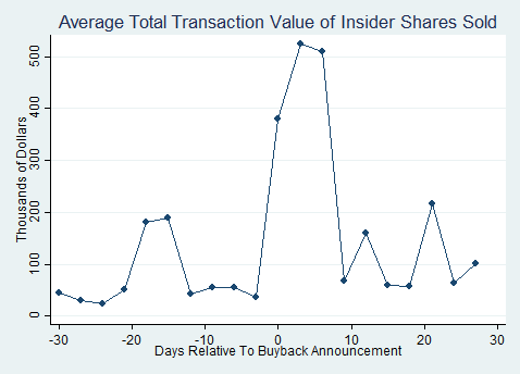 And they tend to sell in unusually large size. According to Jackson, during the eight days following a buyback announcement, executives on average sell more than $500,000 worth of stock each day—a fivefold increase from their typical selling.