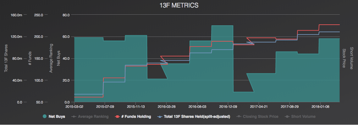 Institutional investors have been steadily accumulating APLE shares as the chart below indicates. Net buys by funds, the number of funds holding APLE shares and total 13F shares held all show positive trends. (Not all funds had reported 2nd quarter holdings as of this writing.)