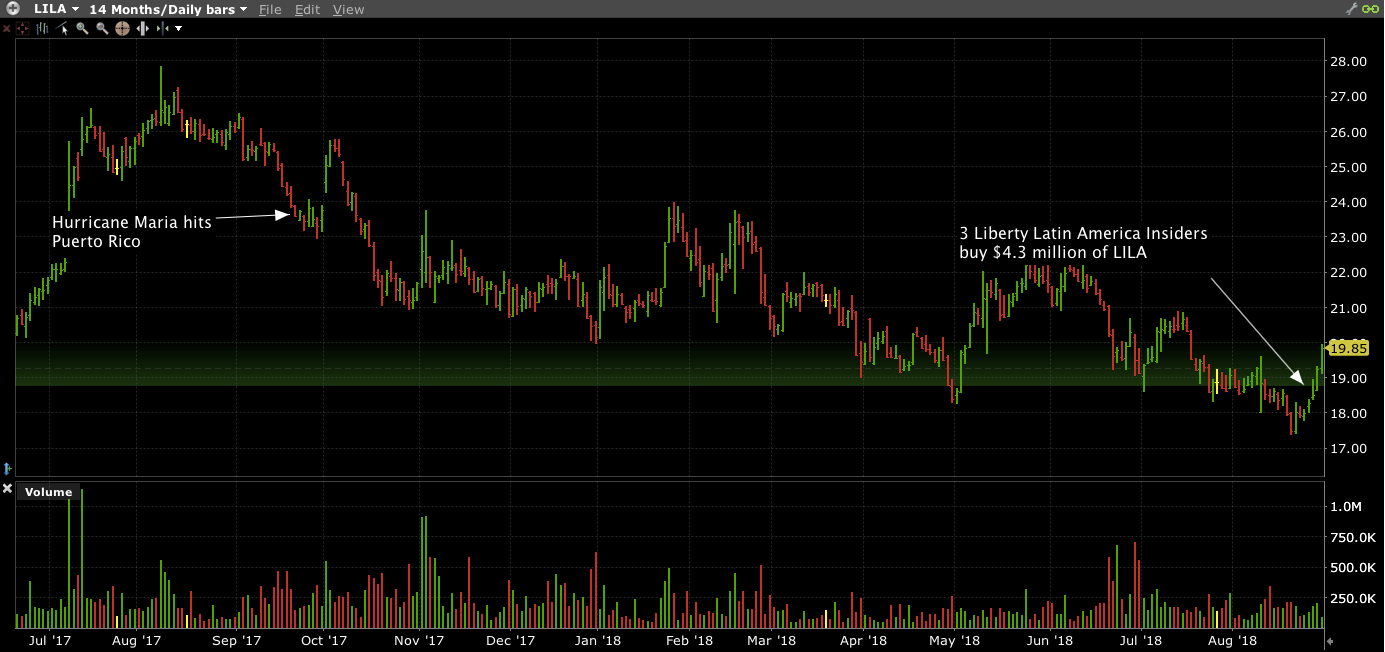 Director Eric Zinterhofer, the founding partner of private equity firm Searchlight Partners, bought 104,303 shares of LILA, about $1.92 million, at an average price of about $18.43 on August 24 and 27. Searchlight was part-owner of the Puerto Rico telecom properties acquired by Liberty Media in 2015. Zinterhofer held no LILA shares personally prior to these purchases.