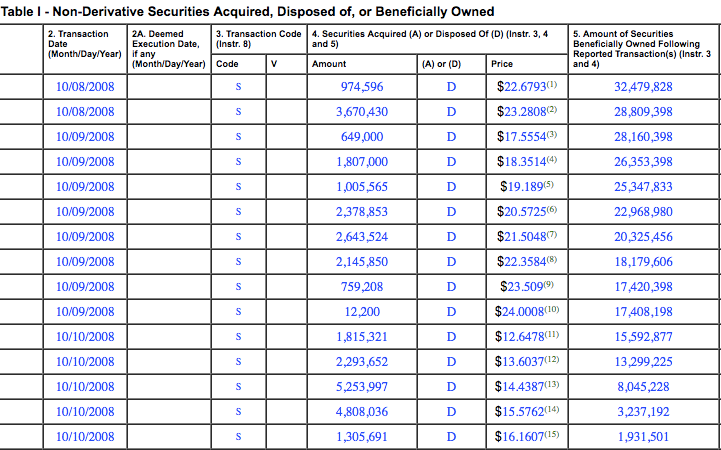 It appears that Chesapeake stock was caught in such a cycle, though based on SEC filings, McClendon’s account didn’t experience forced margin selling until October 8. Below are his actual sales for the period, based on his Form 4 filing. These were the only open market sales Aubrey McLendon ever made as an insider with Chesapeake.