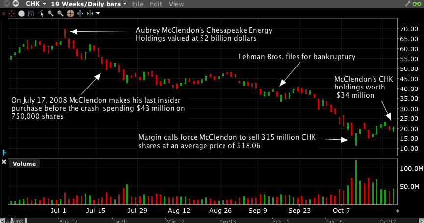 From August of 2005 through July of 2008, McClendon bought 16.8 million shares of Chesapeake stock on the open market as his company’s shares appreciated. He received at least another 3 million shares in grants and options over that time. Over this period, he didn’t sell a share of CHK. Investors marveled at his continual open market buying of his own stock. However, there was something he wasn’t disclosing – he was using margin to pyramid an ever-larger position. When the price of CHK imploded, he was in trouble.