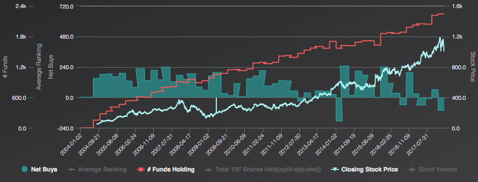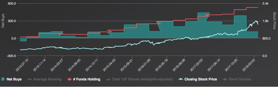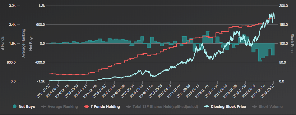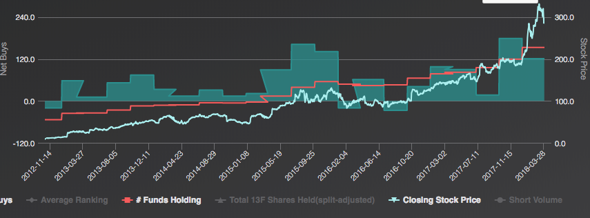 Netflix shows a similar picture of institutional investor infatuation. During 2016, when NFLX was consolidating around $100, there were a couple quarters with small net selling by funds, but since then, NFLX has been on a tear, it’s price tripling over the last two years.as funds can’t get enough of the stock.